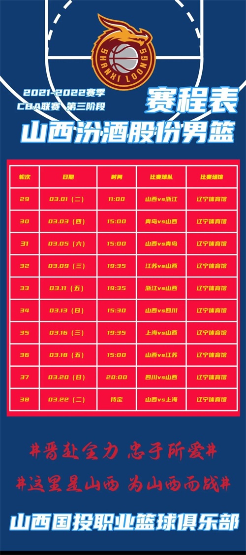 山西汾酒股份男篮将于3月1日迎来首场比赛,在辽宁体育馆对阵浙江稠州金租。以下为常规赛第三阶段赛程表: