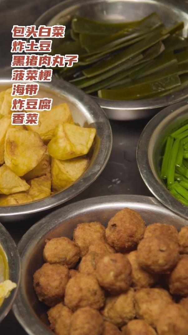 包头白菜、炸土豆、黑猪肉丸子、菠菜梗的搭配可以起到调配颜色,增加食欲的作用。海带、炸豆腐、香菜用来提味。