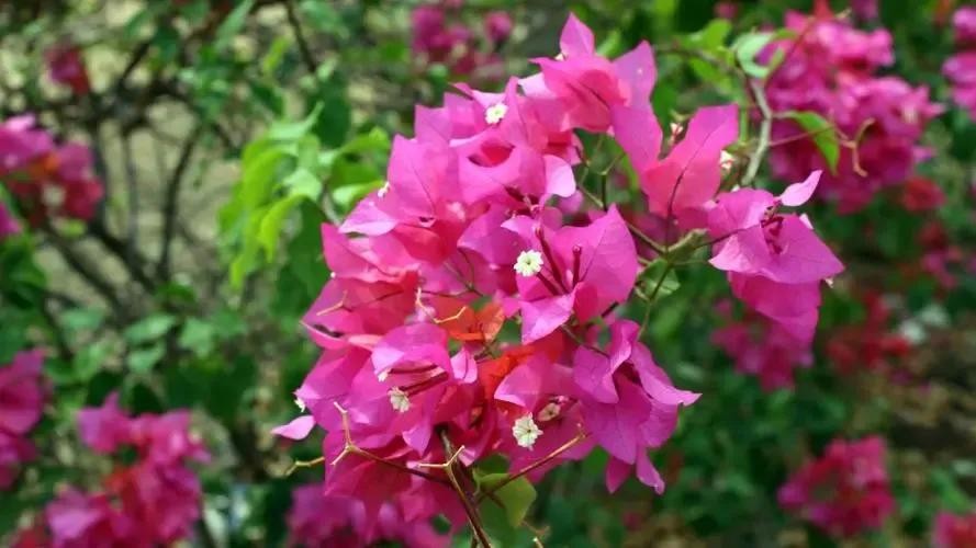 三角梅通常为大型观艺花卉,四季开花,耐高温耐旱能力强,易养活,深受人们的喜爱