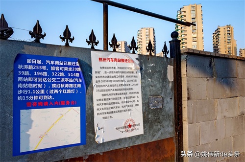 2019年10月24日,位于东宝路曾经的杭州汽车南站大门上张贴着《杭州汽车南站搬迁公告》和指引乘客如何去位于秋涛路255号临时客运站的告示:2019年7月1日起杭州汽车南站终止经营场站业务,2019年7月1日起杭州汽车南站临时客运站启用……