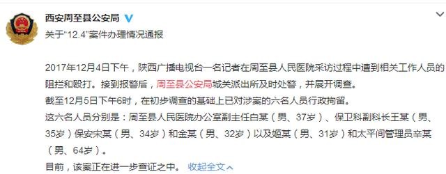 通报中提到,2017年12月4日下午,陕西广播电视台一名记者在周至县人民医院采访过程中遭到相关工作人员的阻拦和殴打。接到报警后,周至县公安局城关派出所及时处警,并展开调查。