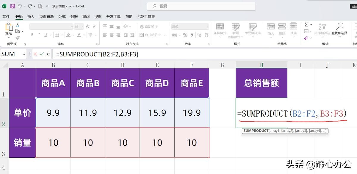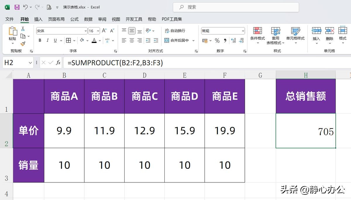 操作步骤:选中H2单元格,在英文状态下输入公式:=SUMPRODUCT(B2:F2,B3:F3),按回车键确认公式,即可返回总销售额705。