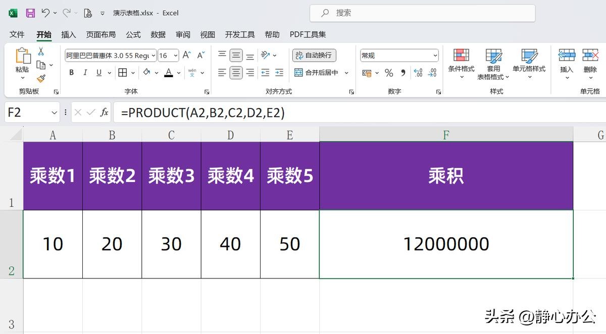 =PRODUCT(A2,B2,C2,D2,E2),按回车键确认公式,即可返回乘积12000000。