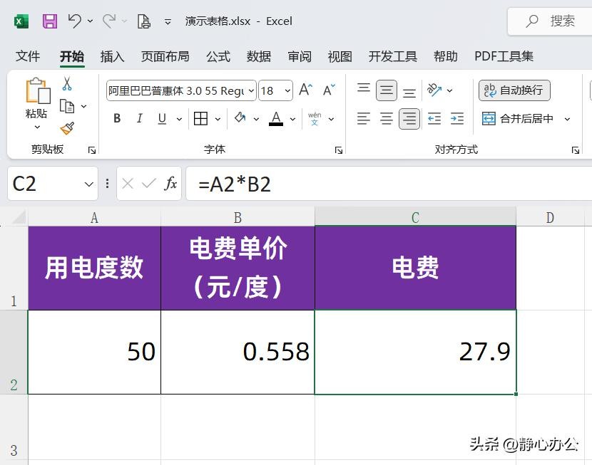 乘法运算符在进行简单乘法运算时也很常用。比如要在下图工作表C2单元格中计算A2单元格中用电度数和B2单元格中电费单价的乘积,可以输入公式:=A2*B2,再按回车键确认公式,即可返回电费27.9。