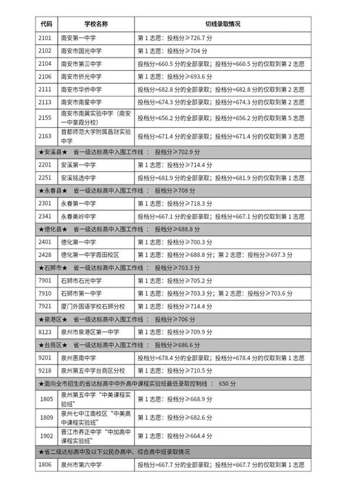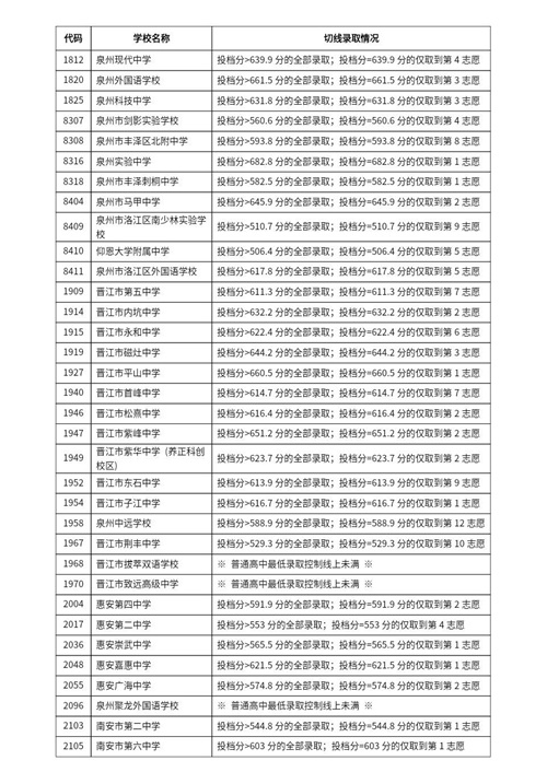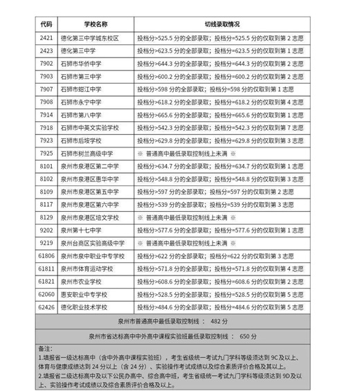 泉州市各县(市、区)省一级达标高中统招入围工作线: