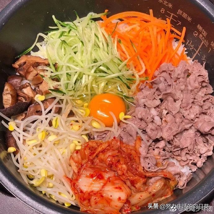 •配料: 米饭适量,菠菜、胡萝卜、香菇、豆芽、黄瓜各适量切丝,牛肉薄片,鸡蛋1个,韩式辣酱、辣白菜、芝麻油、蒜末、酱油、糖适量。