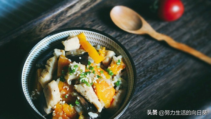 •配料: 大米1杯,南瓜丁200g,鸡腿肉200g切块,洋葱半个切丝,盐、黑胡椒、橄榄油适量。