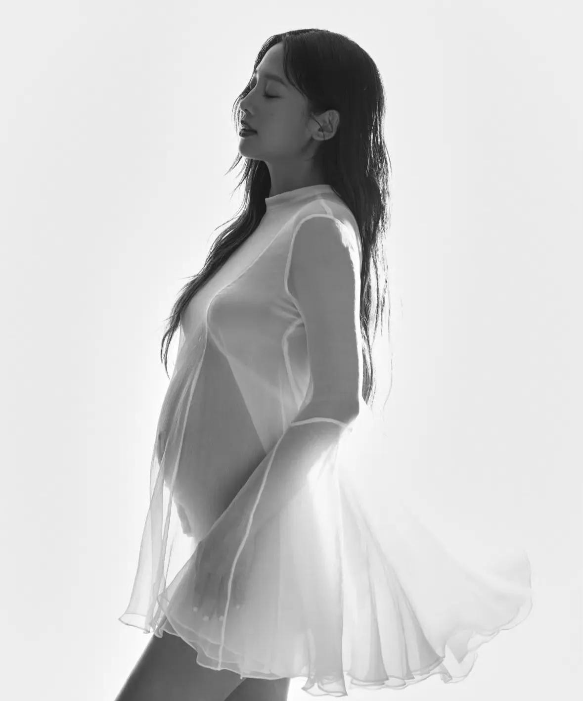 同时,她还分享了两张照片。其中一张是她怀孕时拍的。照片里,她一头长卷发自然垂下,身穿白色薄纱裙,孕肚明显。看得出来,她对小生命的到来很是开心。