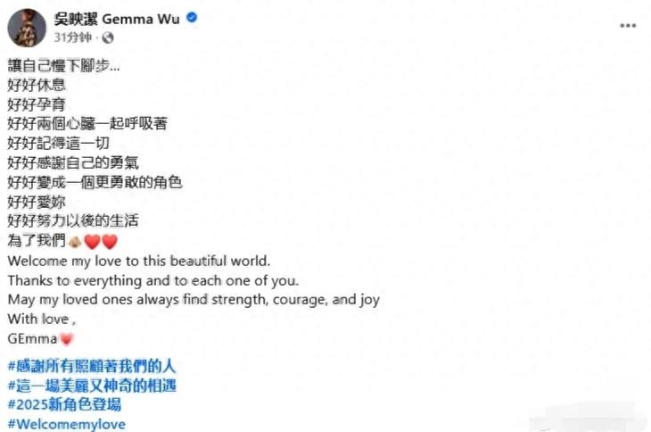 今天,现年35岁的女星吴映洁在社交账号上宣布了当妈的喜讯。