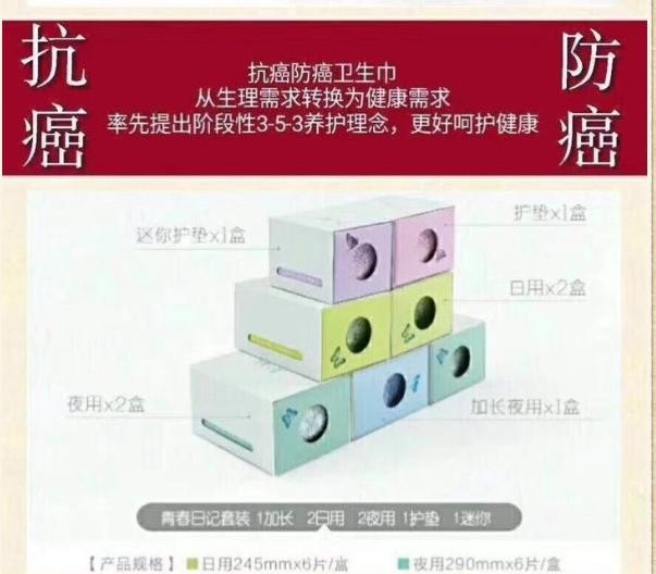 而朗姿青春日记卫生巾,朗姿对外宣传的材料中,有”抗癌“”防癌“字样,宣称“央视合作品牌”“国家专利芯体”。