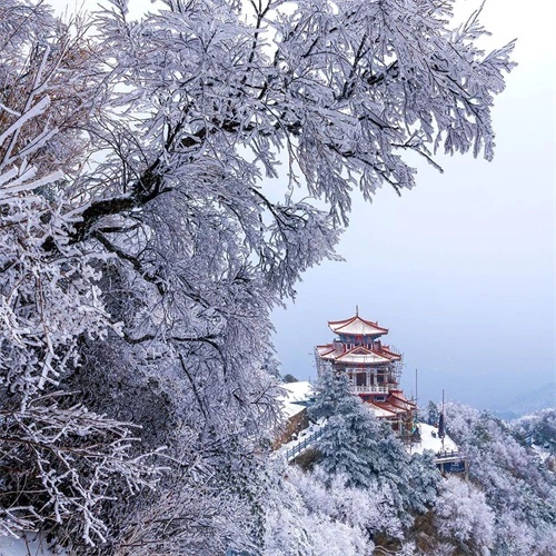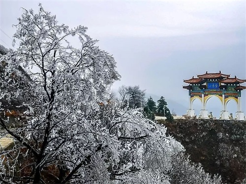 沿着上山的道路走进景区,仿佛步入仙山瑶池,山门、房舍顷刻间就成了琼楼玉宇。银装素裹之下,云雾飘渺,变幻无穷,如同传说中的海市蜃楼,白云山瞬间变回了人间仙境。