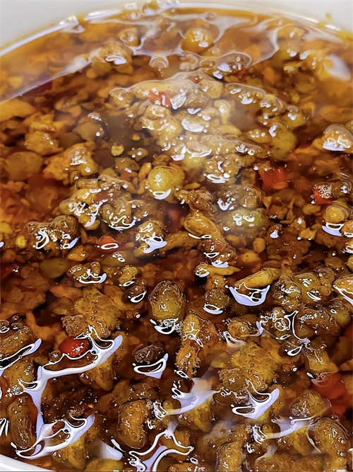 5:调味后翻炒至锅边油色清亮,说明肉酱的水分已被炒干,这个时候就可以盛出来放凉装瓶了。