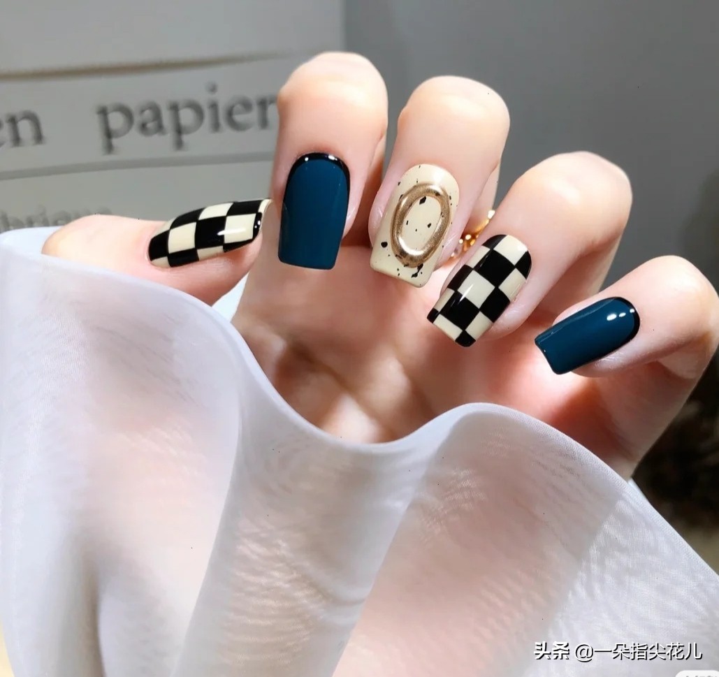 第一款:藏蓝色搭配棋盘格+蛋壳魔镜粉