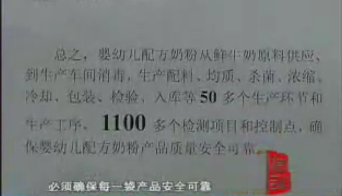 这期节目是07年9月播出的,而恰恰就在1年后的9月,有着1100道检测关的三鹿奶粉就跌入了罪恶的深渊。
