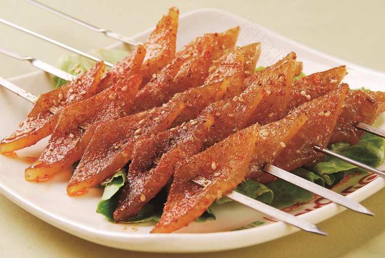 猪皮切成块状或者条状,方便穿串即可。切好放烧烤酱,抓匀,腌制10分钟。把猪皮穿在签子上。