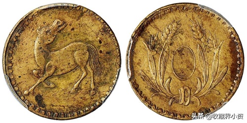 这一版式马兰币内齿粗细相间,风格与反向俯首觅食马相近,应为同一地方军阀造币厂铸造,铸工欠精,但存世极罕,迄今仅发现三枚;周沁园、李平文编著《中国机制铜元目录》中,将其列为马兰系列唯一的一级品,无定价,足见其珍贵非同寻常,PCGS XF40,目前获该公司评级入盒者仅此一枚。
