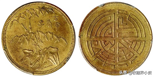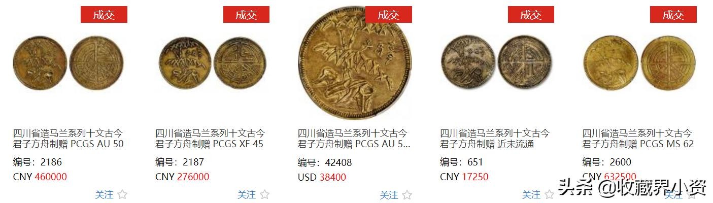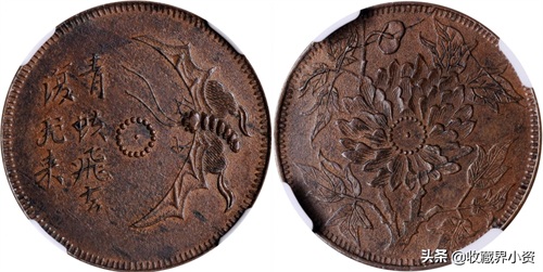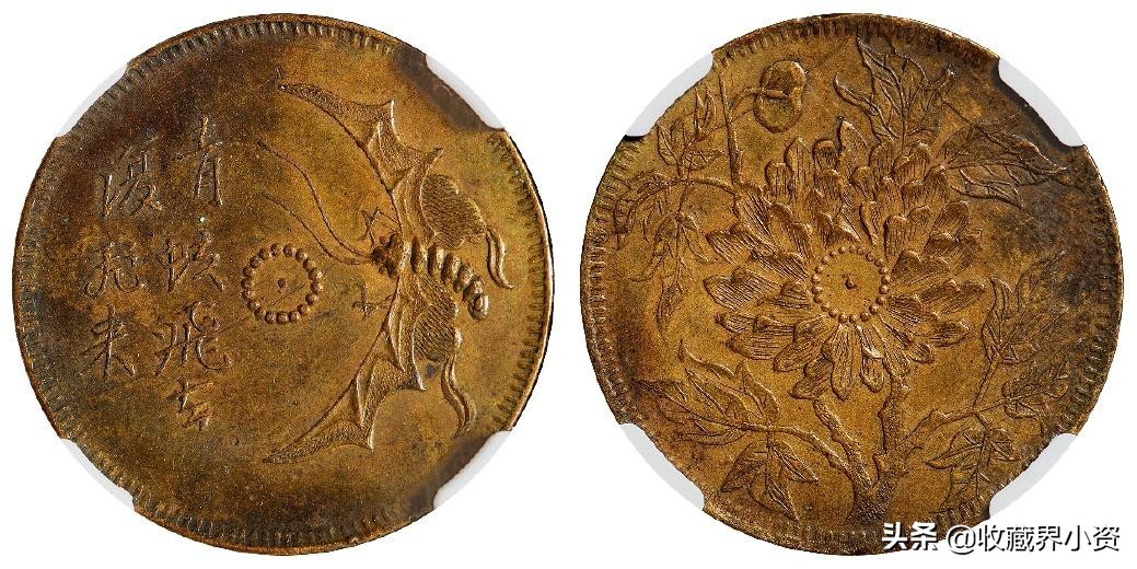 上面这枚是北京诚轩刚刚落槌的一枚,四川省造马兰系列十文青蚨牡丹黄铜 NGC AU 58,黄铜满穿,最后以529000元成交;可以说是好寓意好品相的钱币是一品难求;