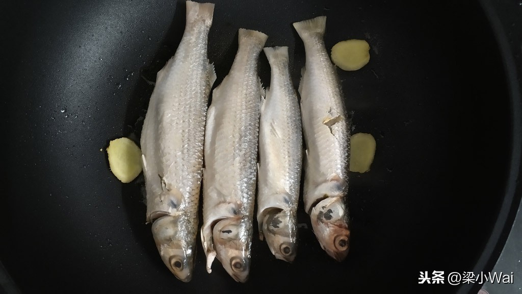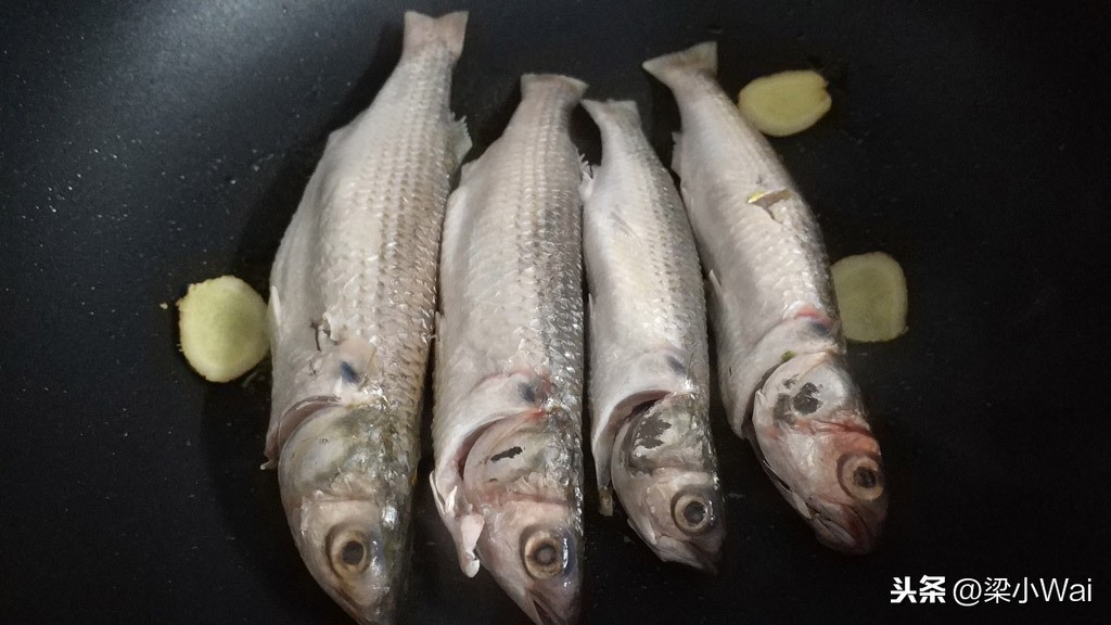 将鲻鱼去鳞开肚洗净,沥干水备用。另外,准备3片生姜起锅时用。