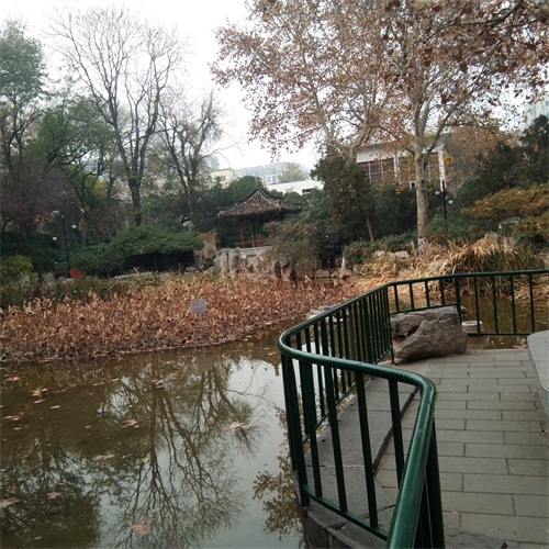 现在正值济南冬天,来到中山公园,虽没有了春秋的华丽,少了红与黄的色彩。但是这里有很多的青笼的绿色松柏、竹林与洁白的山石。我先看了“逸仙轩”,孙中山先生的雕像手持书卷,目视前方,巍然矗立在苍松翠柏之中。在公园中,有古朴典雅的长廊,长廊上有雪白的墙壁、花瓶状的门与椭圆状的窗口。不远处,是一方池水与长亭。池边是一座假山,我从假山下面的洞中穿过,这个“曲径通幽”更加增强了我的探寻的好奇心。穿过这里,是健身广场,一群孩童正在欢快打滑梯,记得小时候,妈妈常常带我来玩儿,她坐在连椅上边织毛衣边微笑的看着我荡秋千、打滑梯、坐电马。济南中山公园,原来也叫人民公园,这里最早是一个古老的商埠,1986年,为了纪念孙中山先生诞辰120周年, 济南市政府决定,恢复中山公园这一名称。在周末的时候,我去参观,往日的情景又让我浮想联翩。