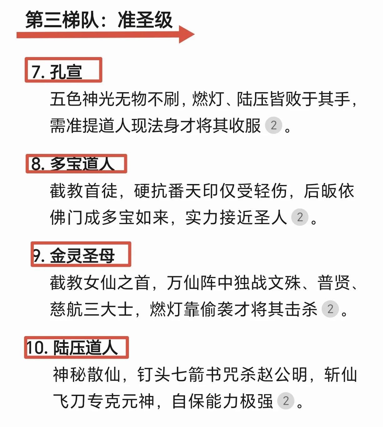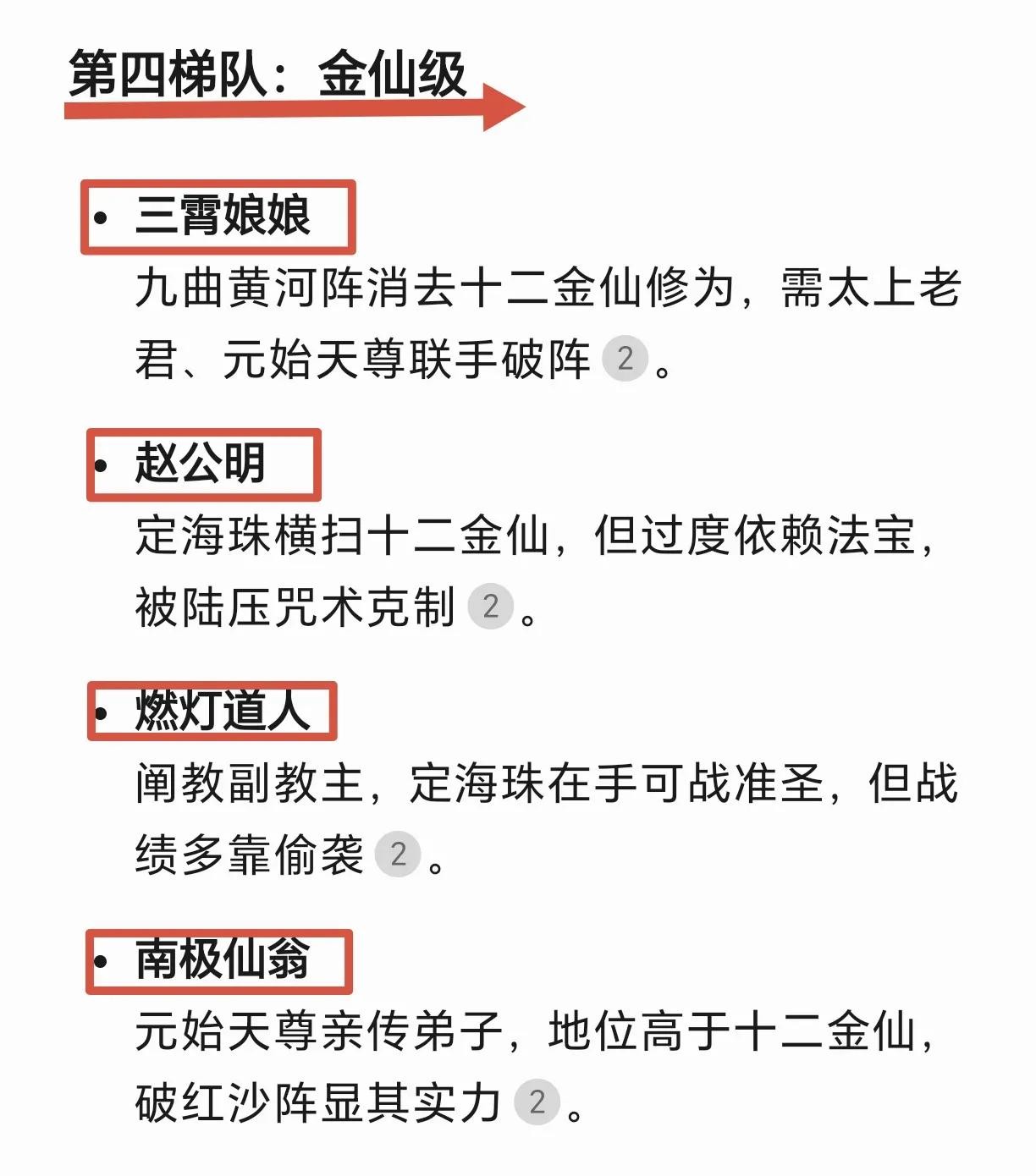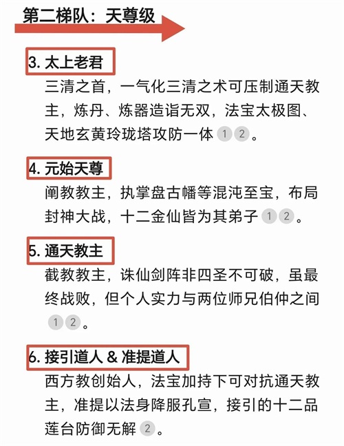 本榜单等级划分分为六个等级,第一等天道级代表世界,无需直接出手;第二等教主级拥有改写天地秩序的能力;第三等准圣级可短暂对抗圣人,但终遭天道反噬;第四等金仙级是法宝与功法结合,形成独特战斗体系;第五等散仙掌握特殊技能但受限于肉身; 第六等凡人级武艺巅峰却难敌法术碾压。