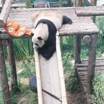 当飞云发现心爱的竹笋被卡在滑梯中间够不到时,它并没有选择放弃,而是利用旁边的抱枕巧妙地将竹笋撞落到地面上,最终愉快地享受了这顿意外得来的美食。