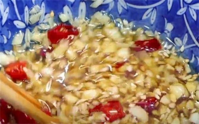 4.再准备几瓣大蒜切片,再切碎放入碗里,再来两个干辣椒剪成小段,放入一勺白芝麻,然后倒入烧好的热油,激发出香味,加入一勺生抽,米醋,两勺食用盐,一勺白糖提鲜,再滴几滴香油增香,用筷子充分搅拌均匀备用。
