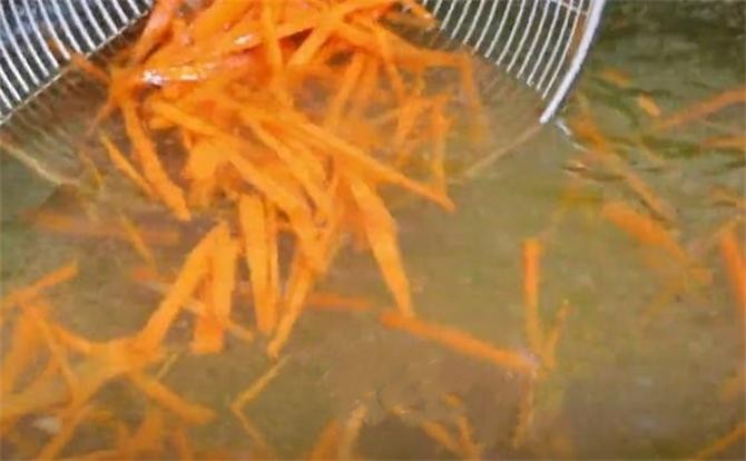 3.准备一根胡萝卜先切片,再切成丝,把胡萝卜也焯一下水,焯熟捞出,也过下凉水。