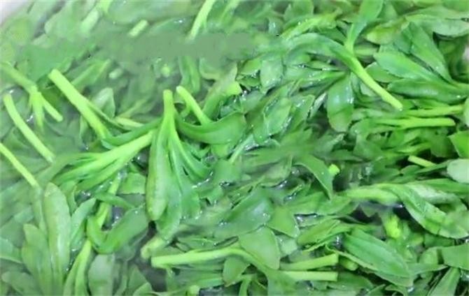 2.锅内水烧开后,把养心菜放入锅中焯一下水,焯水的时间不用太长,20秒就可以了,控水捞出过一下凉水,再控干水分备用。
