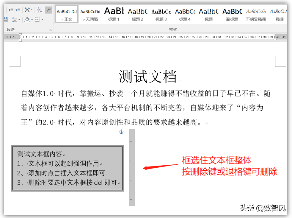 正确操作:打开包含有文本框的word文档。用鼠标左键点击文本框的边线,这样文本框会出现被选中的状态。即文本框会出现调整的把手,而文本框文字不呈现灰色状态。然后按del或者backspace键即可删除该文本框。