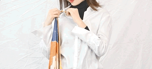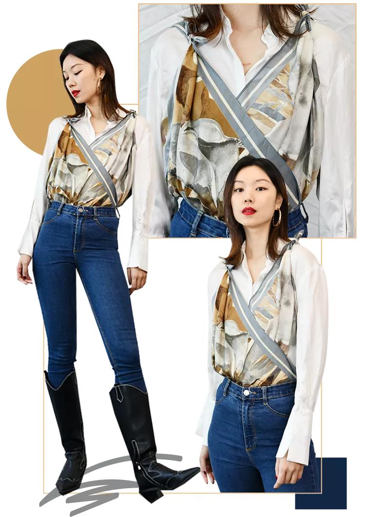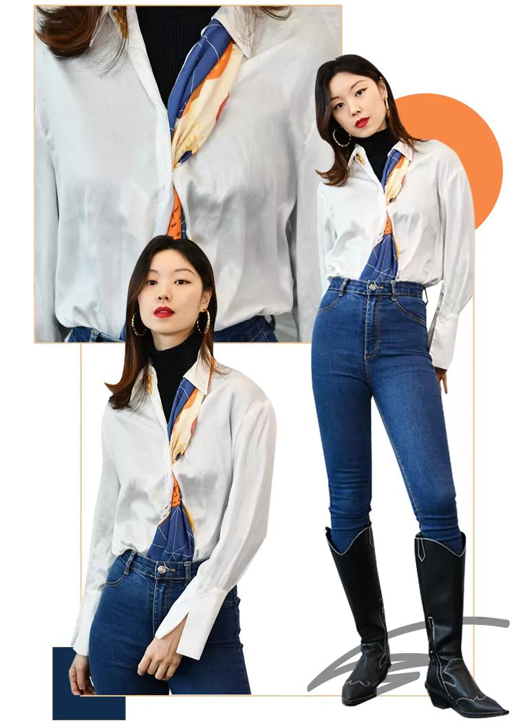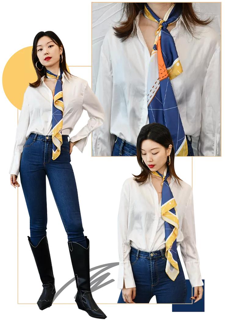 衬衫也是大家容易穿腻的单品,这个时候丝巾自然也能派上用场。用丝巾在领部和扣子的缝隙中做点缀,这种拼接感很有新意,时髦又不会显得过于张扬。特别是对于大胸的妹子来说,丝巾系在衬衫缝隙中能起到向内缩紧的效果,避免了扣子崩开的尴尬,能在一定程度上显瘦。我通常都会用白色衬衫搭配亮色丝巾,组合在一起会更亮眼噢~