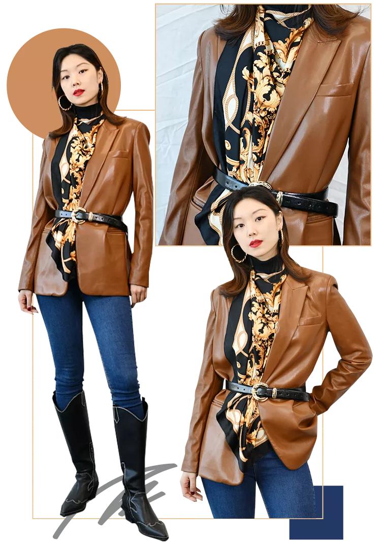 之前跟大家分享过一款丝巾做西装内衬的方法,但对于这类无法用扣针固定的皮质西装又该怎么办呢?也很简单,直接将丝巾在脖子上打结就能形成一个自然并且有垂坠感的内搭。这种方法简单明了,避免了扣针对衣服的伤害,整理起来也更方便。在穿腻了色彩单一的西装时,用丝巾做内衬瞬间就能有惊喜感,提亮效果满分。