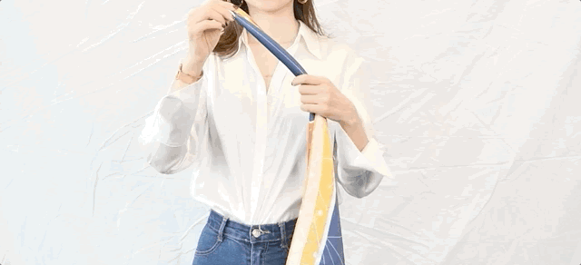 将大丝巾对折成长方形,并对角打结。其中一边穿过手臂,另一边交叉穿过另一只手臂,调整好背后,把丝巾剩余部分塞进裤腰里就好。