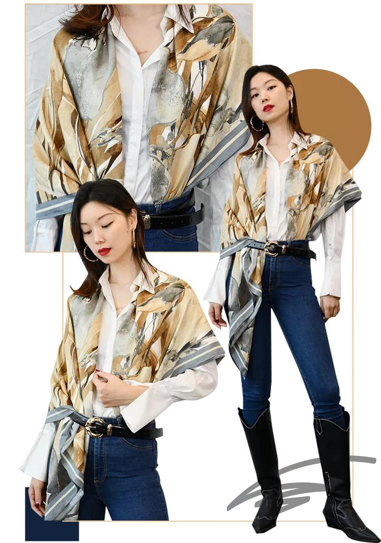 像这种大方巾就非常适合做披肩,但普通的披肩系法真的很容易一不小心就显老气,所以我一般都会在这基础上做出些变化。比如披在肩上的时候尽量使两边长短不一,短的一边看上去精神干练,长的一边则富有设计感,一条丝巾就能在造型上给你两种不同的风格,这就是丝巾作为饰品所带来的奇妙之处。