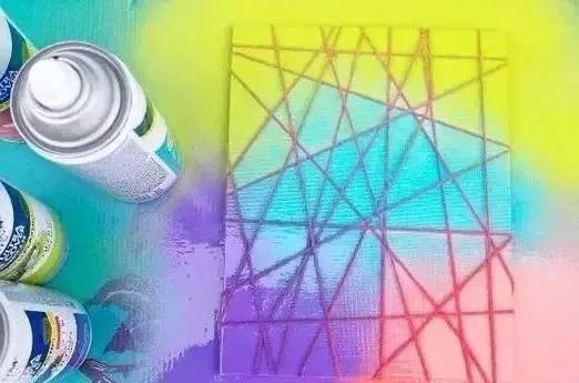 2:把几种颜色的喷漆分别喷在画布的中部和四角。(注意在底部垫好报纸,以防喷出边缘的颜料弄脏桌面)