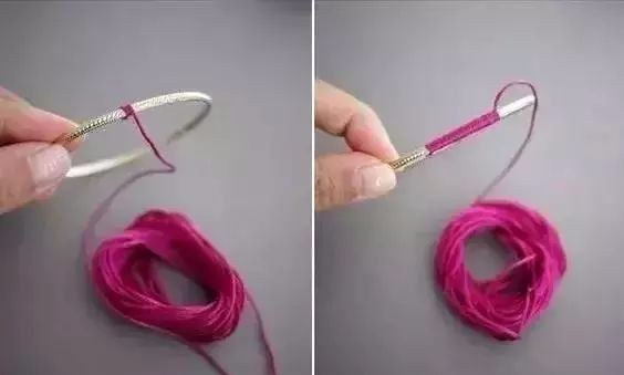 2:将毛线紧紧贴合缠绕在手环上,缠绕完后将多余部分剪去。
