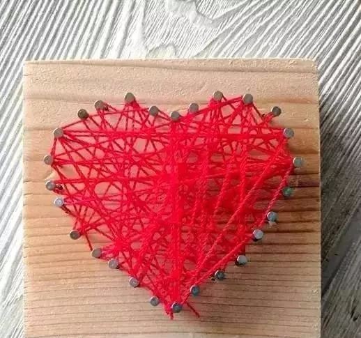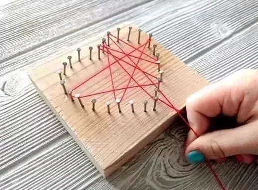 3:将毛线在钉子间随机缠绕,最后以打结的方式固定住。(注意每一圈都要绕紧)