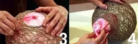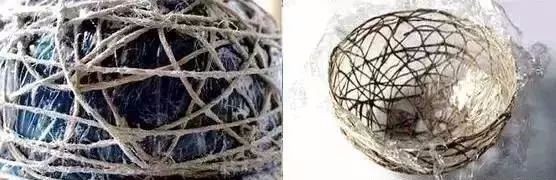 4:把皮球静置一两天直到毛线晾干成型,然后把皮球扎破放气,让皮球慢慢憋掉,然后把气球皮小心抽出来。(可以吊起来晾,也可以放到一个不会被粘住的广口的瓶瓶罐罐上)。