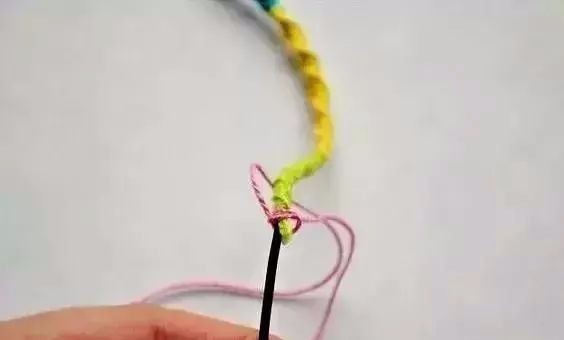 2:在一种颜色的毛线的尾结处,开始另一种颜色的毛线的打结,以此类推,将四种颜色的毛线都绕在耳机线上,就搞定了!