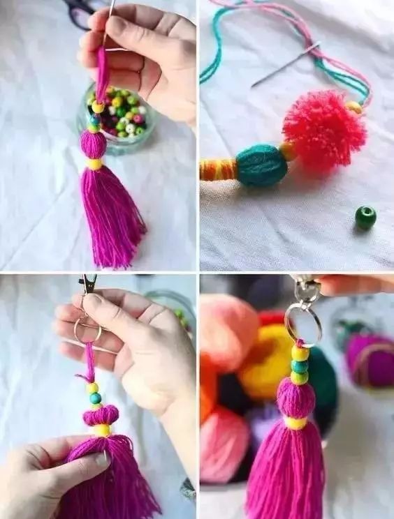在流苏上加些小装饰,还可以搭配上毛球,瞬间就变得民族风起来。还可以挂在各种地方当装饰哦。