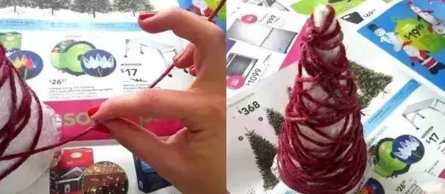 3:把毛线从下至上一圈圈缠绕住锥形的白纸。