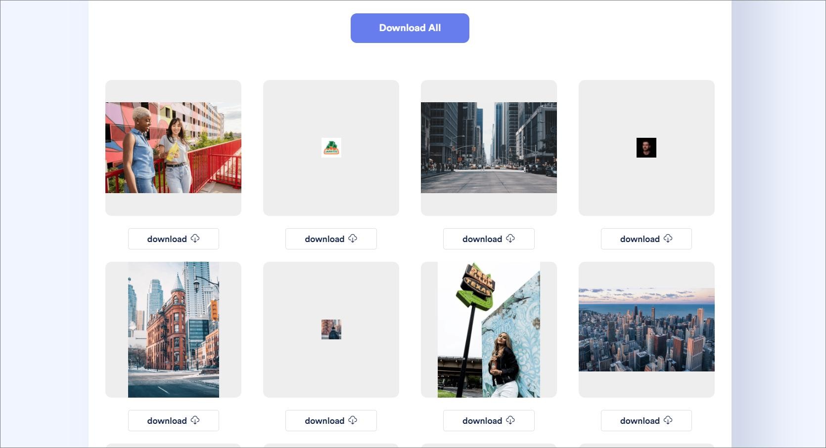 等待片刻,网页上所有图片大大小小,就都被提取出来了,你可以选择某一张图片下载,或者全部一次性打包下载。