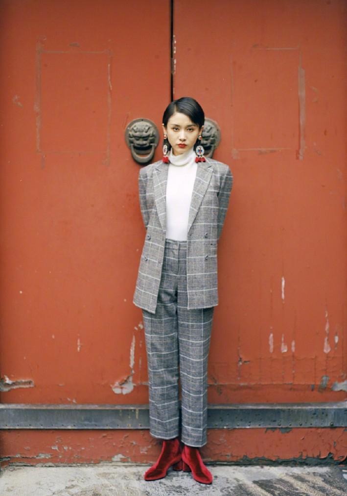 又或是映衬着背景的红色大门,意境都一下子显得开阔了不少。一件清纯的白色小高领针织衫,外搭一袭休闲复古的灰色格纹西装套装,一双红色短靴让简单的造型瞬间就不简单起来了,可以说是一下子点亮了整个造型,连带着整个人都大气了起来。