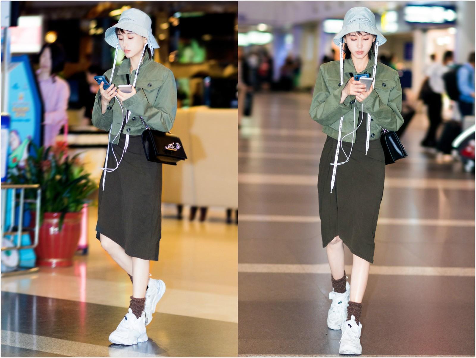 或是戴了一顶浅蓝色的渔夫帽,即使是不施粉黛也看起来清纯动人。她穿着一件卡其绿色的吊带长裙,外搭一件绿色的工装短外套,裙摆下则是纤细修长的小腿,长裙和短外套的搭配非常显高显瘦。矮个子妹子们可以学习一下王子文的穿搭。