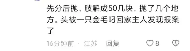 没想到,一条金毛立了大功:金毛在外时发现头颅,吊回家给主人看到,主人报警。