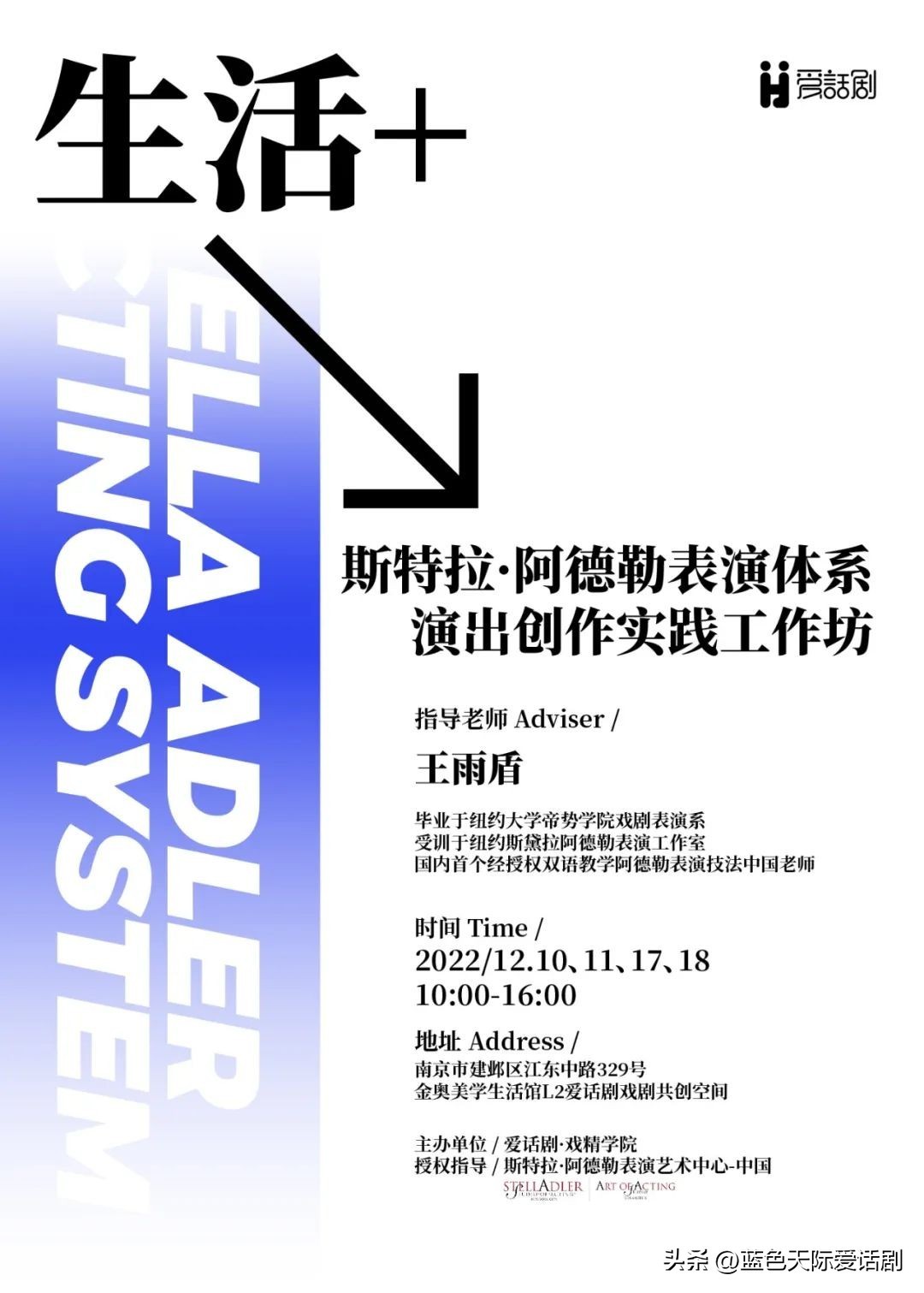 本次由美国斯特拉·阿德勒表演艺术学院唯一中国官方合作教学伙伴斯特拉·阿德勒表演艺术中心(中国)授权指导,爱话剧·戏精学院联合斯特拉·阿德勒表演艺术中心授权老师王雨盾将最纯正的斯特拉·阿德勒表演训练体系引进南京。