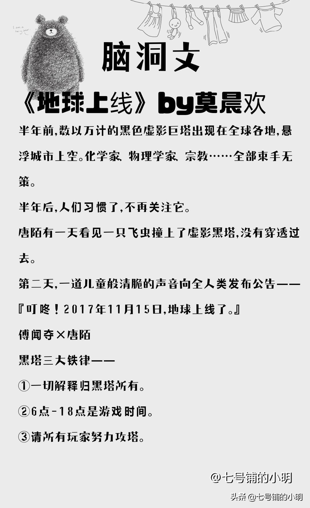 神秘的黑塔降临地球,半年后所有人都被迫加入决定生死的攻塔游戏。攻受在游戏中相识,成为伙伴,前期感情线较少,但是每场攻塔游戏都写得很有意思,游戏boss有马里奥、狼外婆、白雪公主等等,作者脑洞很大。