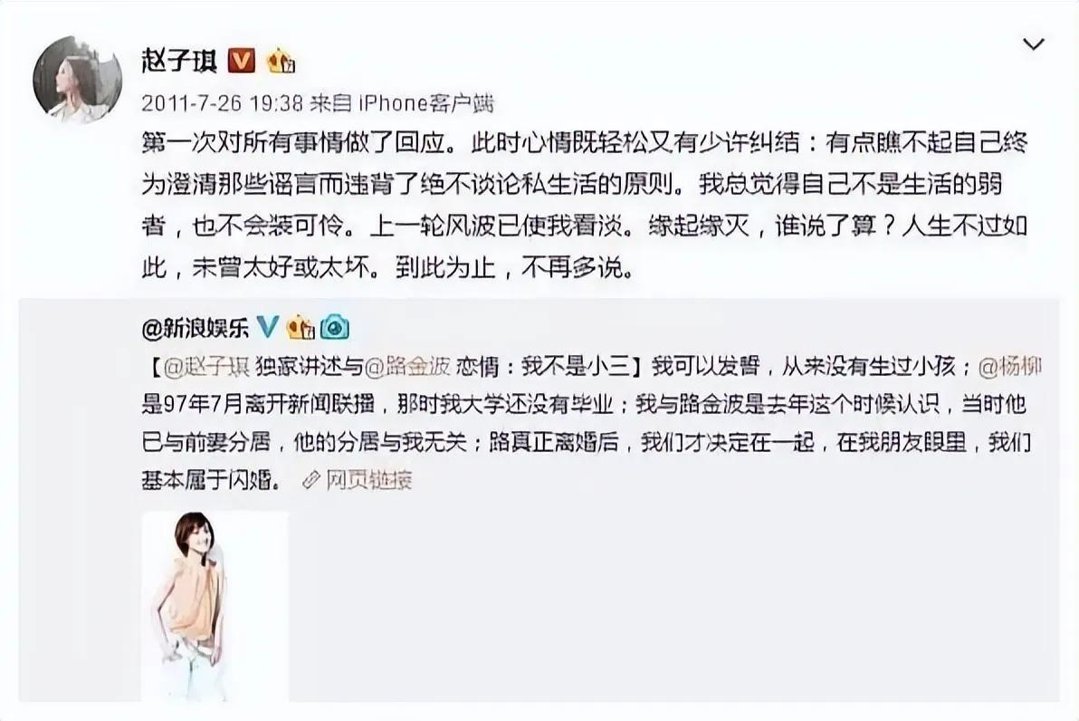 后来,赵子琪回应她和路金波的感情,澄清自己并非“小三”:我和路金波相识的时候,他与前妻已经分居,分居与我无关;路真正离婚后,我们才决定在一起,在我朋友眼里,我们基本属于闪婚。