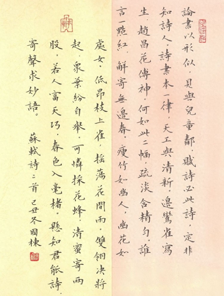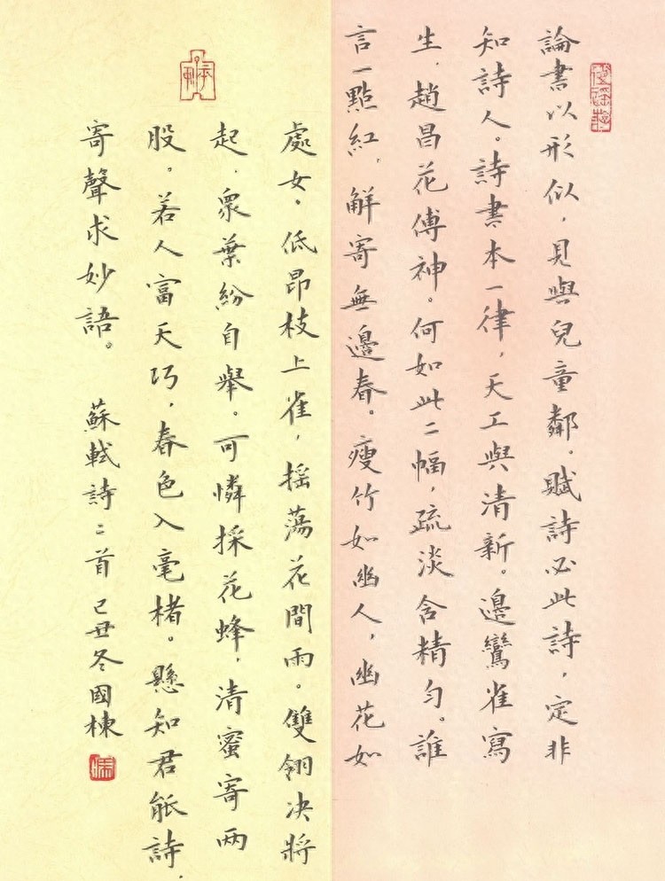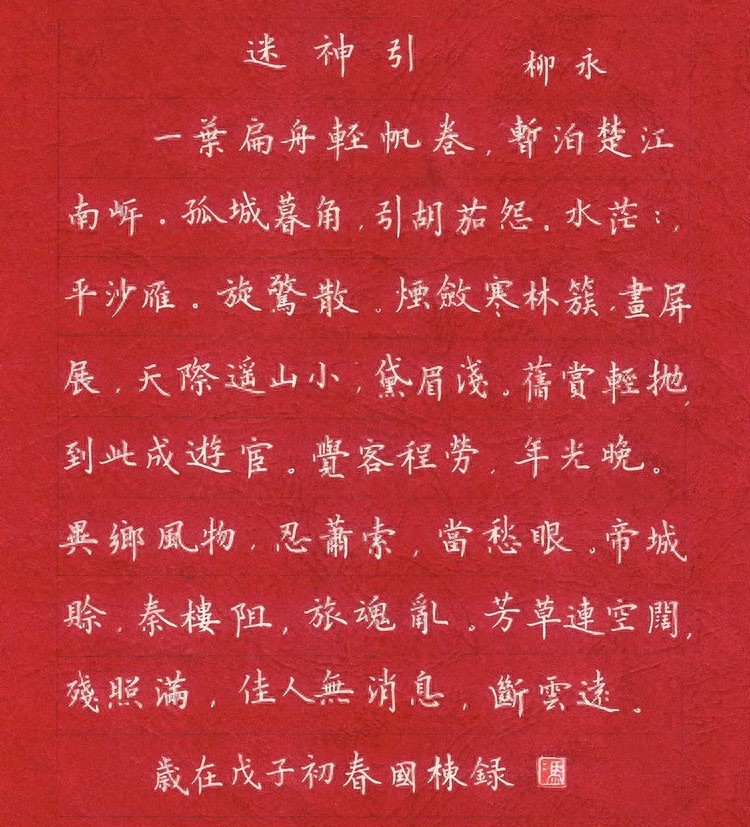 从冯国栋的硬笔书法作品中,我们可以看到他扎实的欧楷基础,同时透着晋唐的神韵,特别是在小楷《灵飞经》中的韵致。这表明他能够将毛笔书法的技巧巧妙地融入到硬笔书法中,展现了创新精神。无论是起笔、行笔还是收笔,他的笔画都十分精准,点画之间的安排也非常出色。他能够相互照应和关照,使前后的笔画能够完美衔接。他的结体圆润,结构精准,特别是一些点画能够灵活变化。例如,他在书法中使用了反捺来代替传统的捺笔,避免了雷同的问题。
