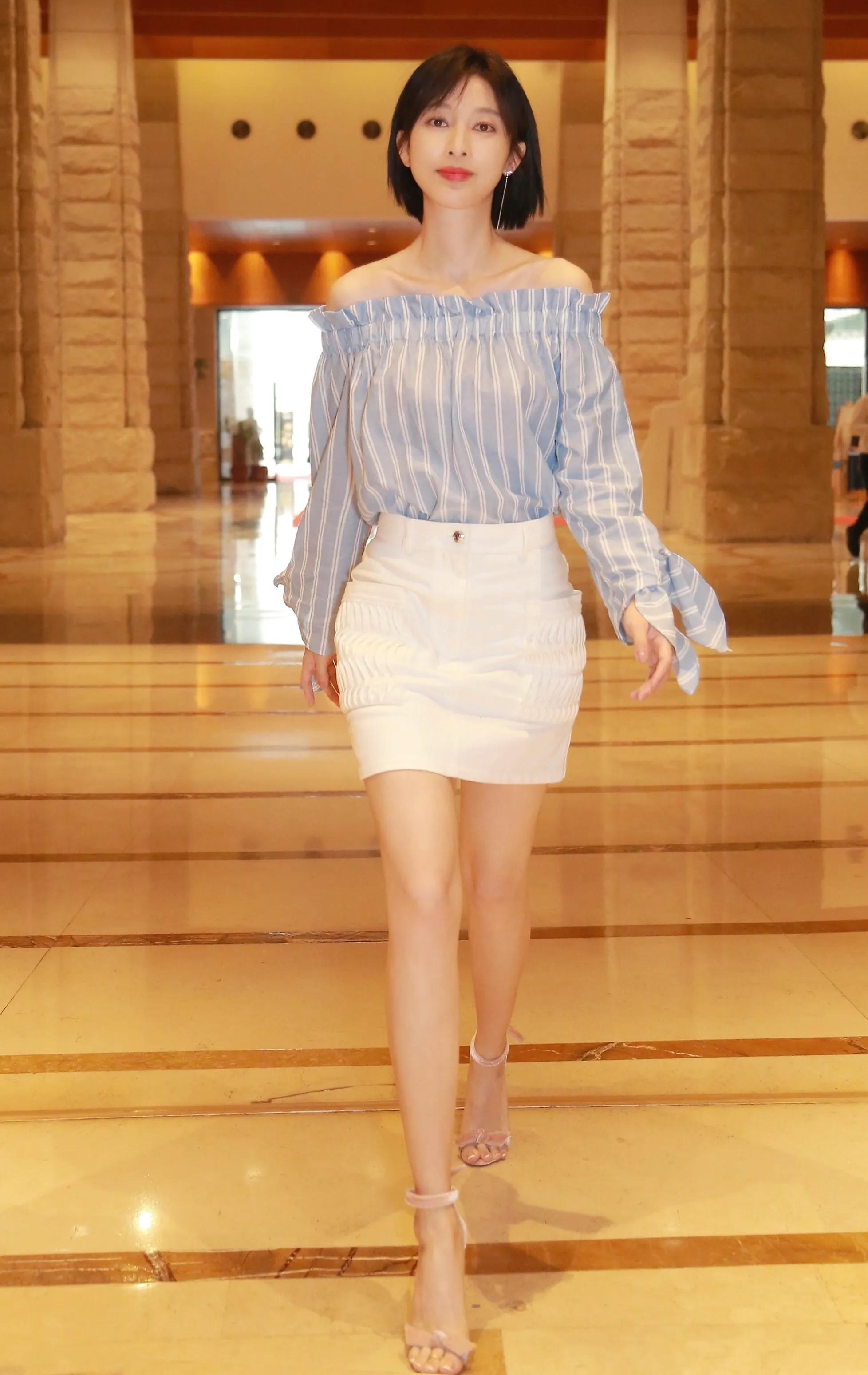 第二套,张俪女神参加节目,身穿蓝色露肩上衣搭配白色包臂裙,脚踩粉色一字带高跟凉鞋,美极了!