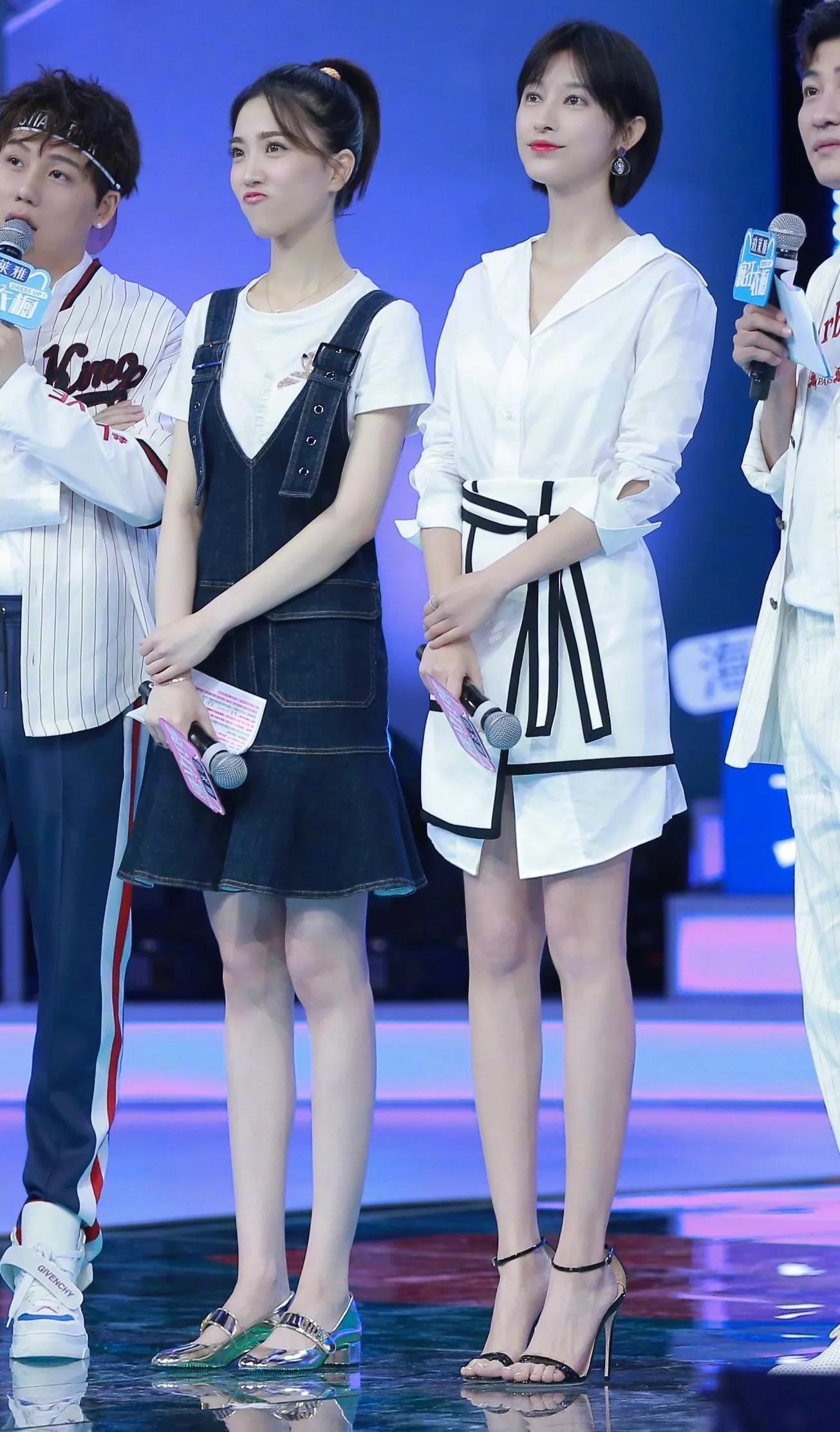 第三套,张俪女神白色衬衫搭配白色短裤,脚踩黑色性感高跟凉鞋。